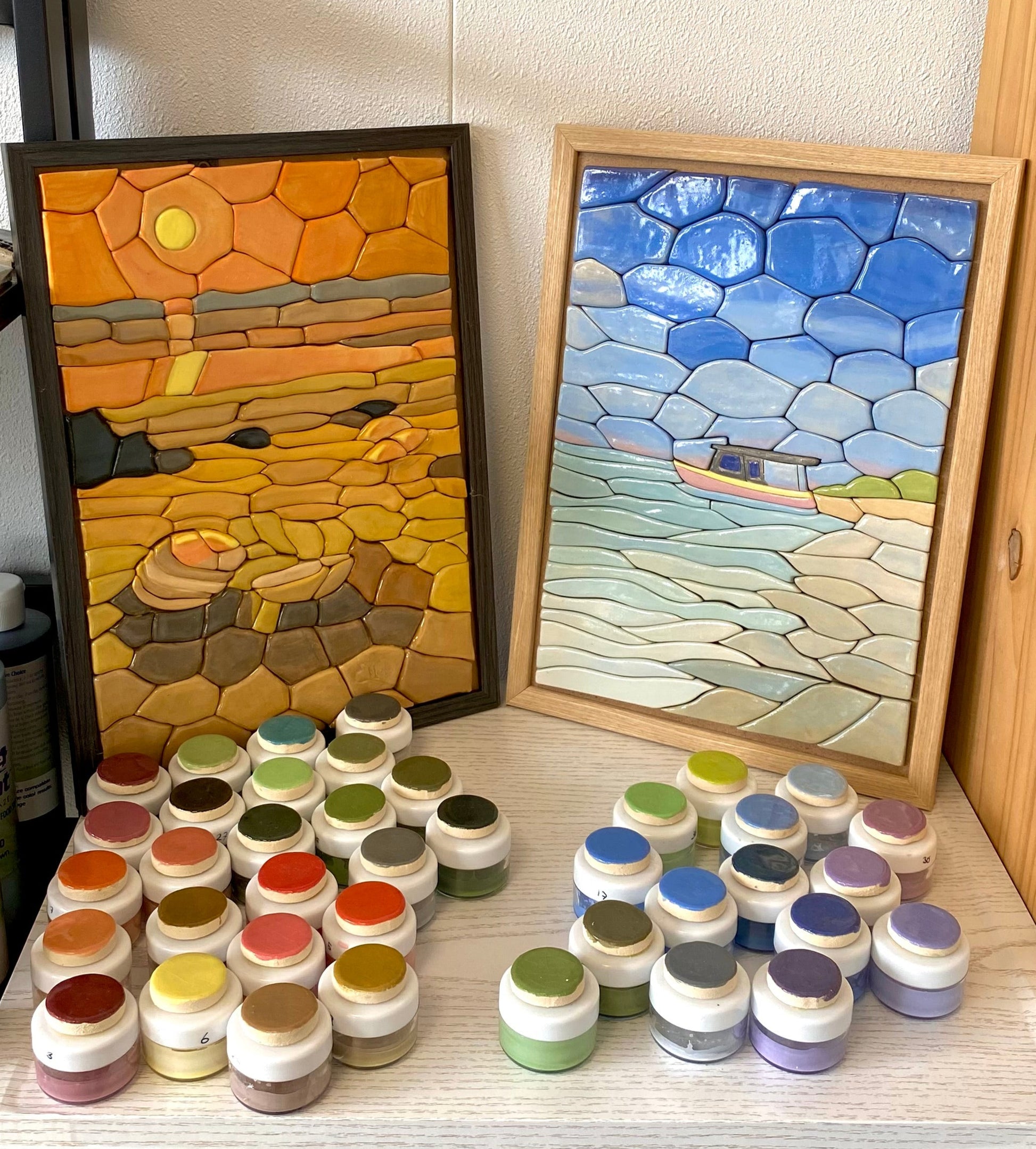 Je kiest je kleuren uit een breed scala van glazuren. We starten met uitleg over hoe glazuur werkt (hoe kleuren veranderen in de oven, tips voor combinaties), en dan ga je je mozaïek stukjes beschilderen. Dit wordt verdeeld over 2 lessen zodat je ontspannen zonder tijdsdruk te werk kan gaan.