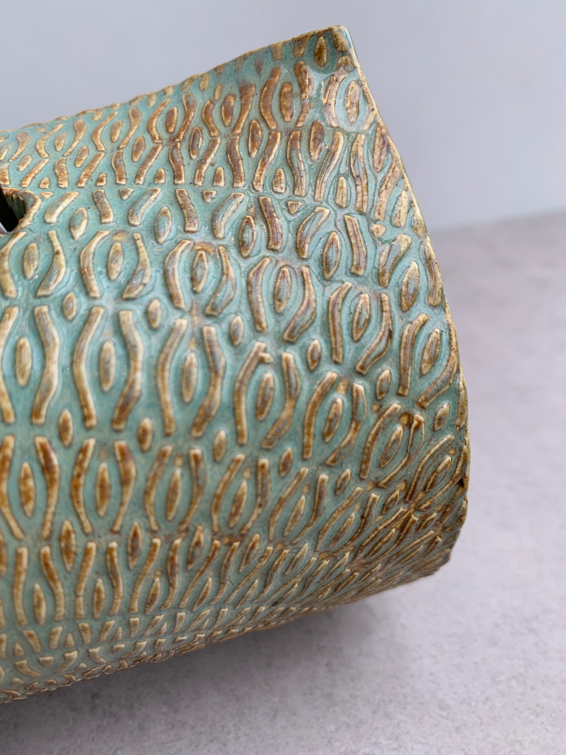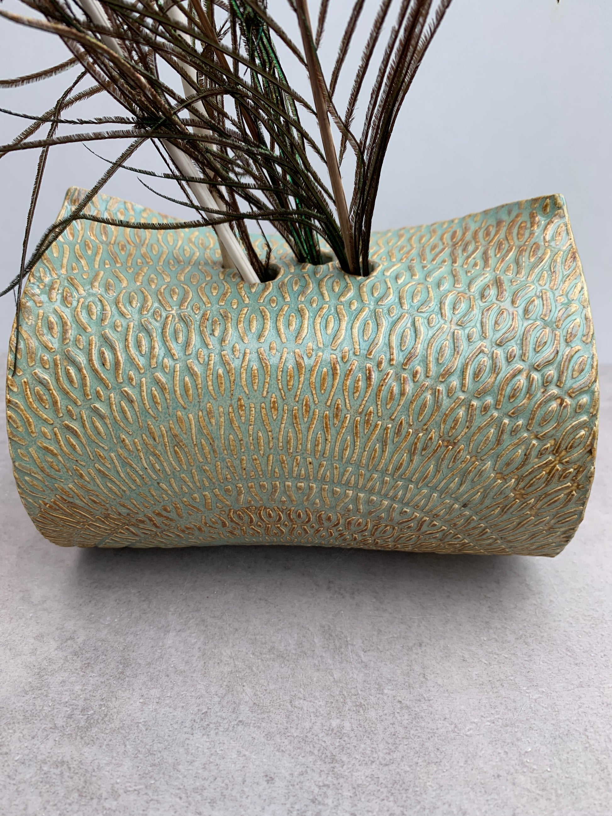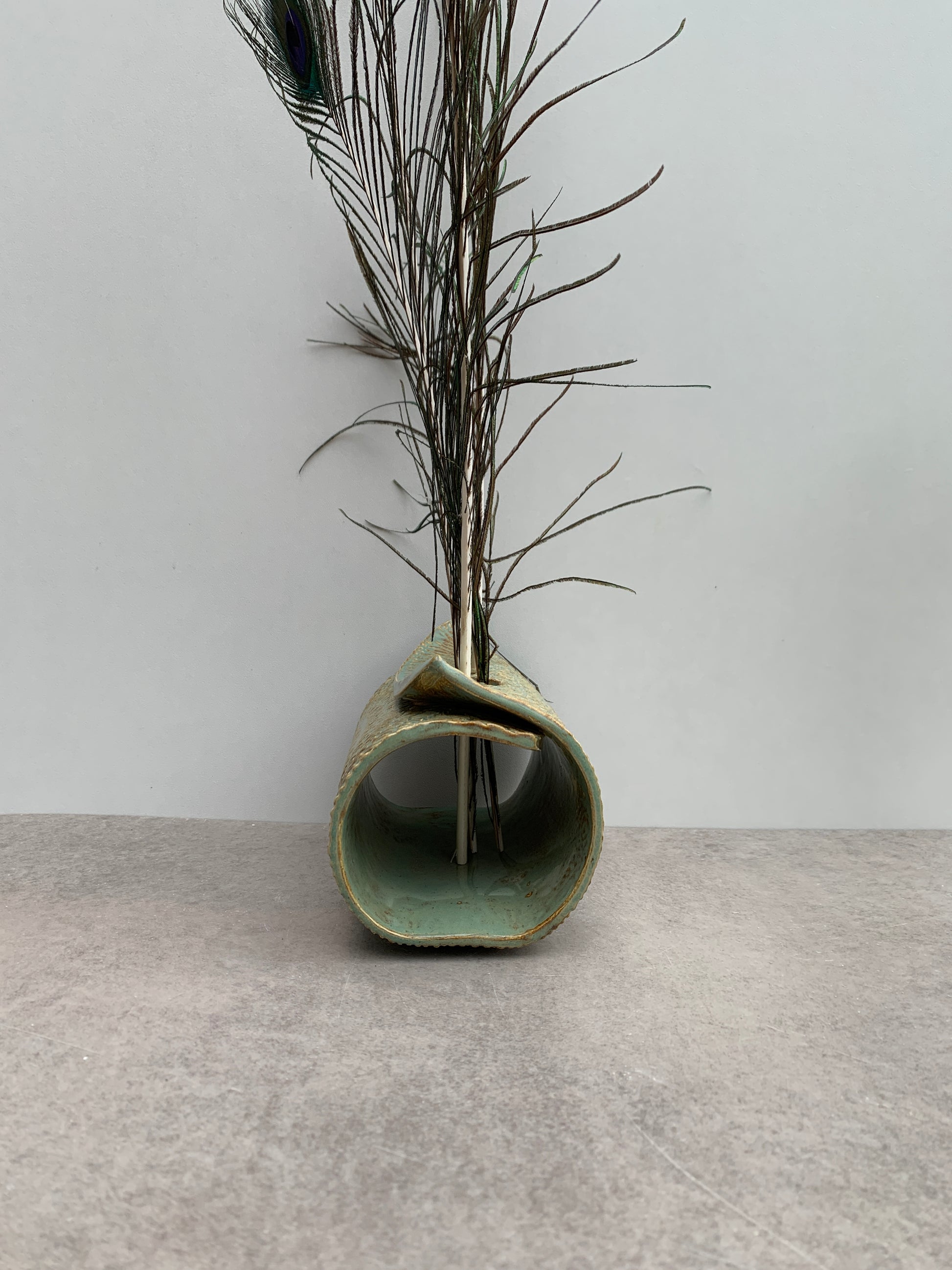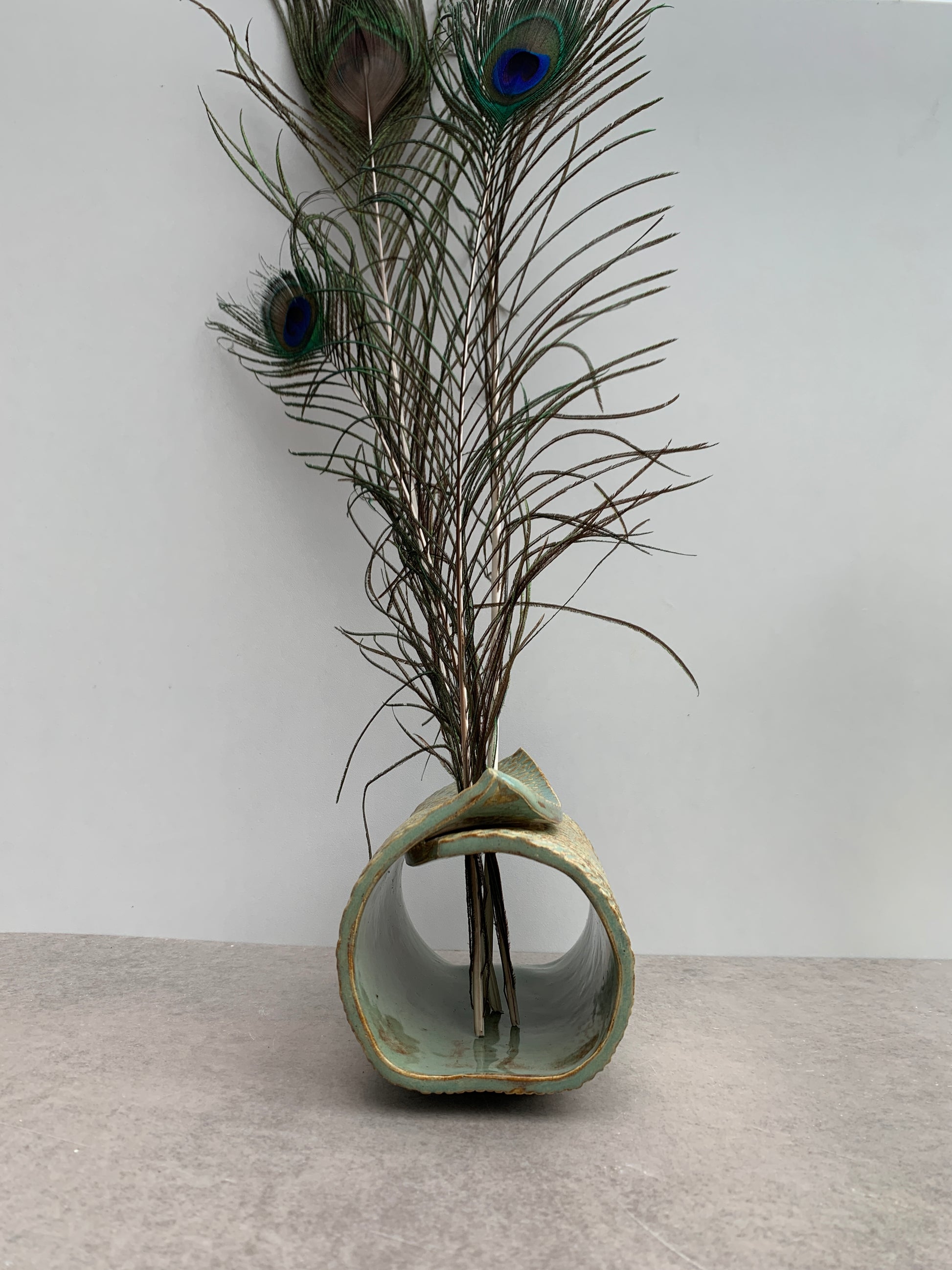 Breng een vleugje natuur in je huis met de Pluimenhouder, een prachtig stuk dat de schoonheid van bloemen of veren op een unieke manier viert. Dit kunstwerk is niet alleen functioneel, maar ook een statement van stijl en creativiteit. Perfect voor een schikking van bloemen of een verzameling veren. De combinatie van groene en turquoise tinten, samen met de subtiele bruine tinten, maakt deze verenhouder een ideale aanvulling voor elke ruimte.