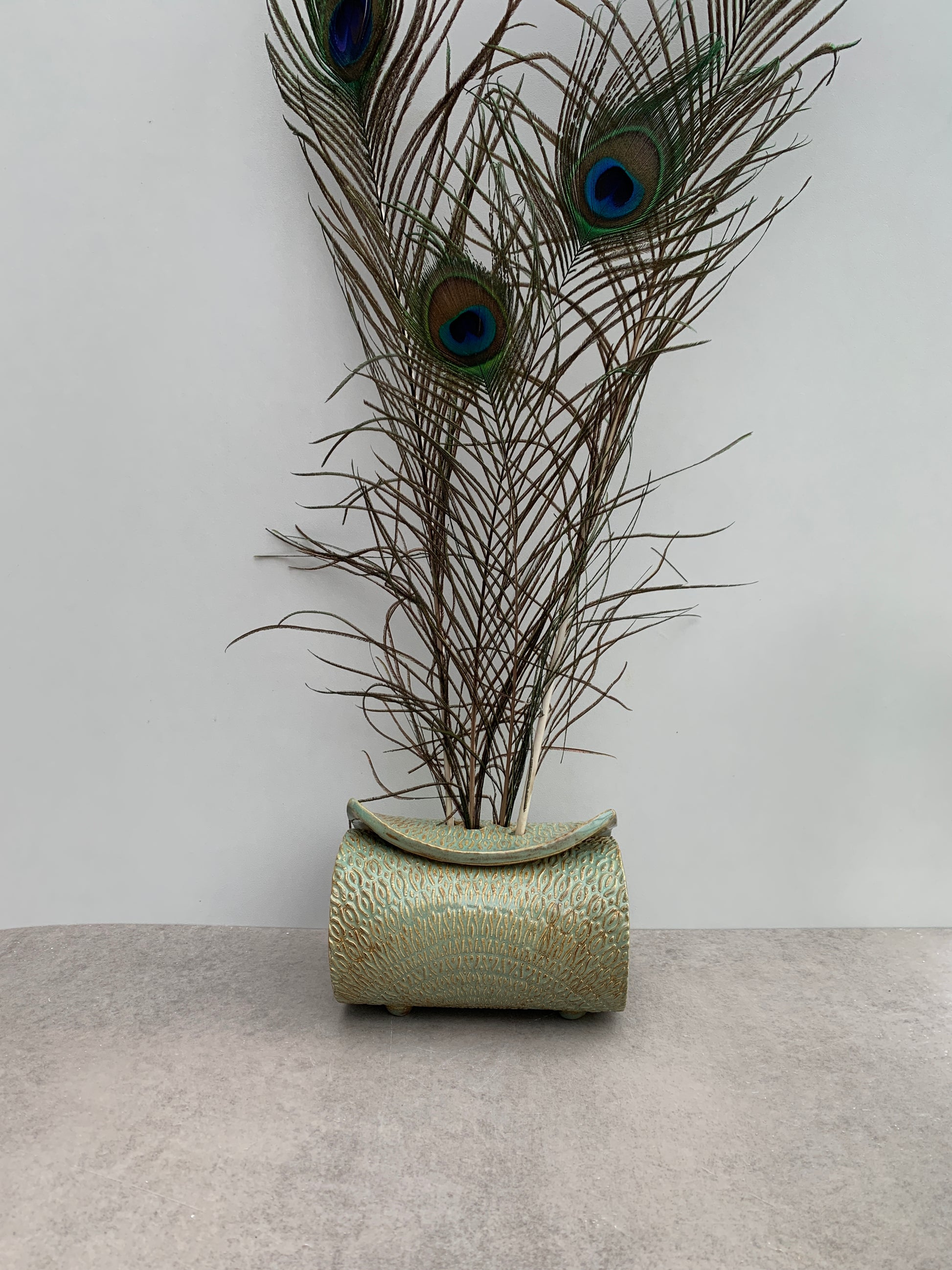 Uniek: Deze handgemaakte verenhouder heeft een prachtige textuur, waardoor de diepe kleuren van groen en turquoise prachtig tot hun recht komen. De bruinachtige accenten voegen een organisch element toe, waardoor elk stuk uniek is.