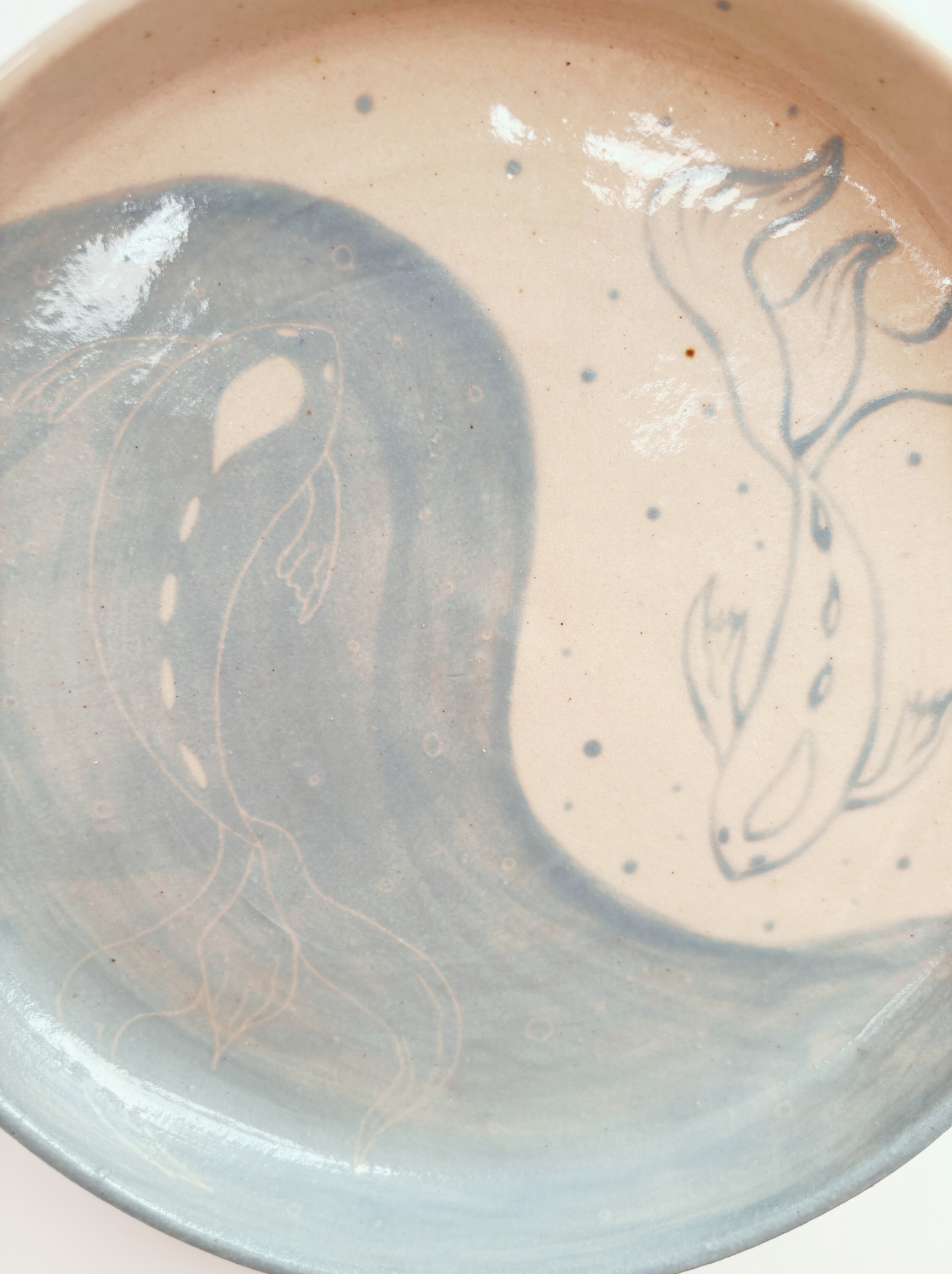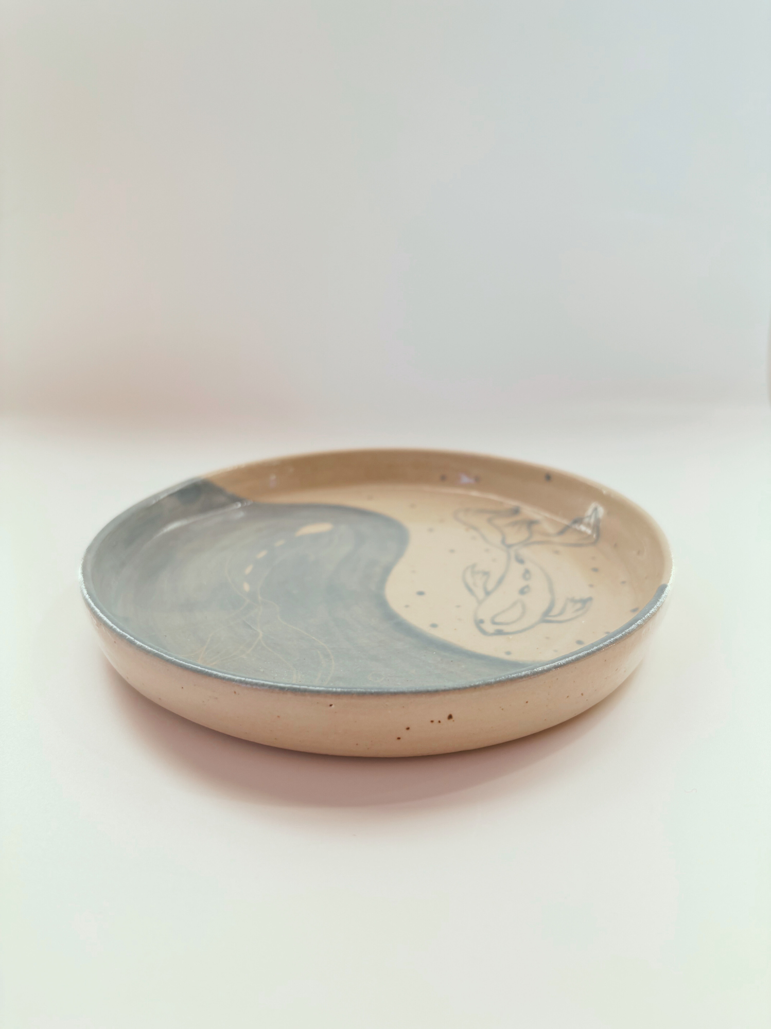 Dit keramische bord toont twee sierlijke koi vissen die in een yin-yang symbool zwemmen, een tijdloos teken van balans en harmonie. De blauwe en witte kleuren geven het ontwerp een rustige uitstraling. Met een diameter van 16 cm en een hoogte van 1,5 cm is het perfect voor kleine gerechten of als decoratief stuk om sieraden op te leggen. Elk bord is met de hand gemaakt, waardoor elk exemplaar uniek is.